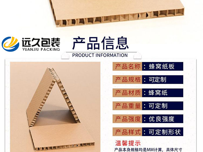 蜂窩紙板全部由可循環再生的紙材制作,可節木代木,以質輕、價廉、強度高、可回收等特性深受市場歡迎,已成為具有節省資源、保護環境的一種新型綠色包裝。 由蜂窩紙板制作的包裝箱是中國出口商品的理想包裝,蜂窩紙板的推廣應用,一方面可降低商品在流通過程中的破損率;另一方面,取代木箱,利于環保。 蜂窩紙板的性能: 1、從力學角度分析蜂窩紙板,封閉的等六邊形蜂窩結構相比其它結構,能以最少的材料獲得最大的受力。紙蜂窩夾芯是把無數個空心立體六角形用膠接法連接成一個整體受力件。所以蜂窩紙承載能力大,抗壓性能好(紙蜂窩夾芯平壓強度比瓦楞紙芯強度大20 倍以上)。 2、由于紙蜂窩夾芯的結構,吸收物體撞擊能量大,所以防震性能好,隔熱、隔音效果好。 3、重量輕并且省紙張,蜂窩紙板受垂直于板面的載荷時,它的彎曲剛度與同材料、同厚度的實心板相差無幾,但重量卻輕70~90%,而且不易變形,使得蜂窩紙板可以被廣泛用于多種應用領域。(一張一平方米的紙,可以制作一張5毫米厚、一平方米大小的紙蜂窩夾芯。用紙蜂窩夾芯做包裝箱,比同規格瓦楞紙包裝輕三分之一)。 4、蜂窩紙板易于切削、鉆孔,可以加工成各種所需的形狀和尺寸。同時,它與其它結構材料有很好的相容性,適合用作緩沖襯墊。 在全球環保低碳化包裝的形式下,中國包裝工業在向低碳經濟轉型中,提出了“以紙代木”的重大決策,環保蜂窩紙板全部由可循環再生的紙材制作,可節木代木,以前出口運輸包裝首選的木箱包裝在很多行業已經被蜂窩紙板包裝箱取代。蜂窩紙板包裝箱的推廣應用,一方面可降低商品在流通過程中的破損率;另一方面,取代木箱包裝利于環保保護森林資源。 環保蜂窩紙板使用后可全部回收再利用。即使棄之不用,也可自然降解、吸收,是很好的綠色環保材料。蜂窩紙板由柔性的紙芯和面紙做成,具有較好的韌性和回彈性,獨特的蜂窩夾芯結構提供了優異的緩沖性能,在所有的緩沖材料中具有更高的單位體積能量吸收值,高厚度的環保蜂窩紙板可替代現已大量使用的eps塑料泡沫緩沖墊。